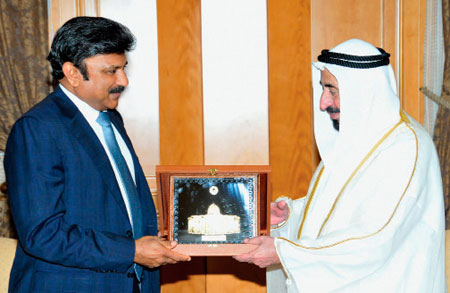 Lalu samuel being honoured by H.H.Dr.Sheikh Sultan Bin Mohamed Al Qassimi Bin supreme council member, Ruler of sharjah