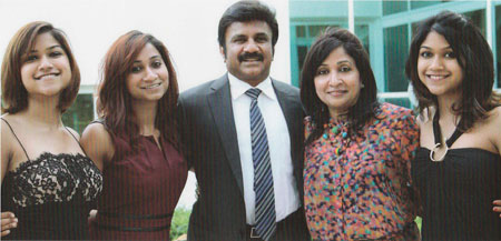 Lalu Samuel is married to Lovely, daughter of the late Mr P C Abraham from Thiruvalla, who lived in Bahrain from 1955 and retired as the General Manager of Grey McKenzie in 1982. Lovely, a postgraduate rank holder from Mahatma Gandhi University, is also one of the directors in the company. The couple is blessed with three daughters. Michelle, the elder daughter, is an Electrical and Communication Engineer. Also a good athlete, she was the captain of the school basketball team. Moreover, she is a black belt holder in karate. The two younger daughters, Ashley and Angela, are twins. Ashley is a student of Management in Finance and Accounts in the UK. She was the school athletics champion and has participated in Inter-school athletics events and Inter- School basketball tournaments. She also holds a blackbelt in Karate. Angela, a Lawyer from Reading University, too was an athlete like her sisters and an inter-school basketball player. She also holds a blackbelt in Karate. Besides, Angela has been selected from the school to meet the former President of India, the late Dr A P J Abdul Kalam.